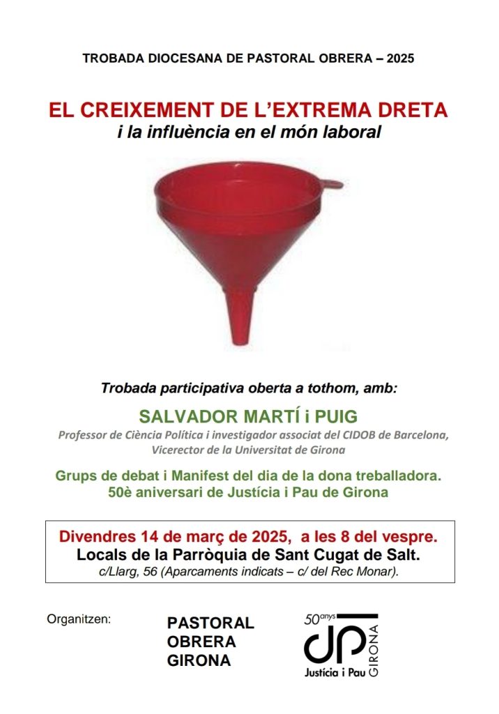14 de març a les 20h, als locals de la Parròquia de Sant Cugat de Salt, tindrà lloc una trobada participativa amb Salvador Martí i Puig. Es debatrà sobre el Creixement de l’extrema dreta i la seva influència en el món laboral.