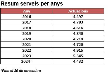 Al llarg de 2023, els Bombers de la Generalitat han realitzat 5.345 serveis per incendis en edificis, superant per primera vegada en vuit anys la xifra de 5.000 intervencions. Aquestes dades suposen un increment del 8,7% respecte a l’any anterior. Durant el 2024, fins al 30 de novembre, s’han registrat 4.432 serveis, amb una mitjana mensual de 400 intervencions, incloent-hi els incidents menors sense víctimes ni grans danys materials.