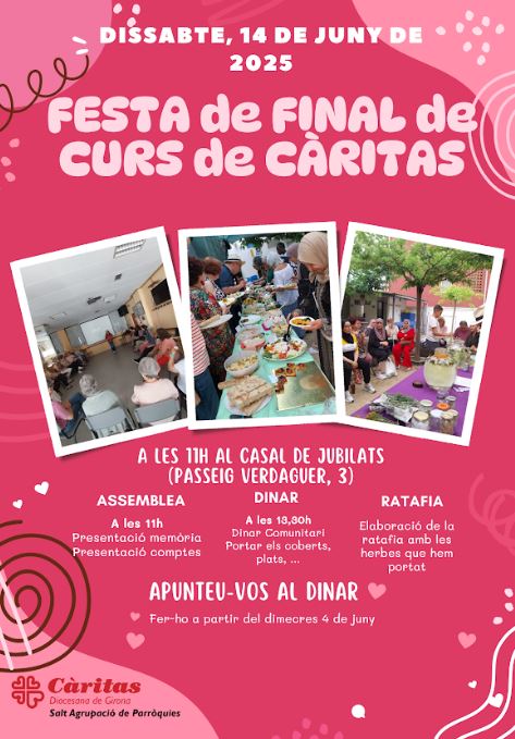 El dissabte 14 de juny de 2025 celebrarem la Festa de Final de Curs de Càritas Salt amb una jornada ben especial plena de comunitat, records i tradicions! Ens trobarem al Casal de Jubilats (Passeig Verdaguer, 3) a partir de les 11 del matí, començant amb l’assemblea anual, on es presentaran la memòria i els comptes del curs. Cap a les 13.30h serà l’hora del Dinar Comunitari: cada persona ha de portar un plat cuinat (per a un màxim de 4 persones), juntament amb els seus propis estris —plats, coberts, gots i si pot ser, algun estri per servir. Després de dinar, ens endinsarem en la tradició amb l’elaboració col·lectiva de la ratafia.
