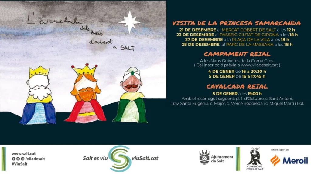 El dia 5 de gener, després del Campament Reial, Ses Majestats els Reis d’Orient rebran les claus de la ciutat de mans de l’alcalde Jordi Viñas. A partir de les 19 hores, Salt s’omplirà de màgia amb la Cavalcada de Reis, el moment més esperat per petits i grans.