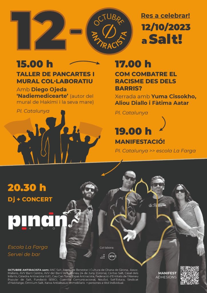 La plataforma Octubre Antiracista ha convocat una manifestació per al 12 d’octubre a les 19h, amb l’objectiu de visibilitzar i combatre el racisme. Sota el lema “Prou racisme, ni a Salt ni enlloc”, la manifestació recorrerà els carrers de la població, expressant un rebuig categòric al racisme i la discriminació. La jornada començarà a les 15 hores amb un taller de pancartes i un mural col·laboratiu amb l’artista Diego Ojeda «Nadiemedicearte», seguit d’una taula rodona a les 17h sobre com combatre el racisme des dels barris. La manifestació, que sortirà de la Plaça Catalunya de Salt, culminarà a l’escola La Farga, on es llegirà un manifest que reclama una perspectiva antiracista en el funcionament de les entitats socials i polítiques.