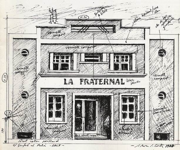 Sobre aquest plànol he fet el projecte de colors i l’he lliurat a l’Ajuntament perquè hi donin el seu vist-i-plau, si els agrada. Del local se’n dirà “LA FRATERNAL” i la gent hi anirà -o hi anava- a prendre cafè i a fumar caliquenyos, a jugar a cartes, a despotricar del Sistema, a conspirar o a fer projectes per fundar un Orfeó.