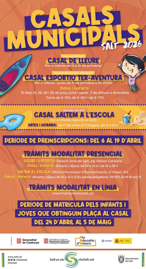 L’Ajuntament de Salt posa en marxa una nova edició dels casals municipals d’estiu amb una oferta de prop de 600 places per a infants i joves. Les famílies podran fer la preinscripció del 6 al 19 d’abril, tant de manera telemàtica a través del web municipal com presencialment en diversos punts habilitats.